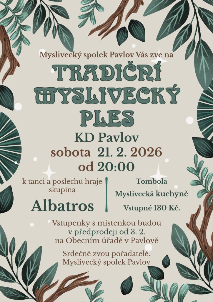 Myslivecký spolek Pavlov Vás zve na TRADIČNÍ MYSLIVECKÝ PLES, který se koná v SOBOTU 21. 2. 2026 od 20:00 v KD Pavlov. K tanci a poslechu hraje skupina Albatros. Vstupné 130 Kč. Předprodej na Obecním úřadě v Pavlově.